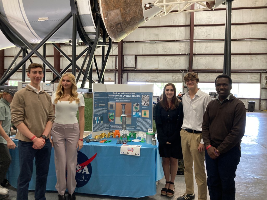 Five South High School students—Oliver Coombe, Aurora Mick, Aiden Deutchman, Joshua Buzobozi, and Vivienne Pilch—recently traveled to NASA’s Johnson Space Center in Houston, Texas, to present their innovative lunar lander project after being selected as finalists in the 2025 NASA HUNCH (High School Students United with NASA to Create Hardware) program. As part of an Engineering Career and Technical Education (CTE) class at South High, the students designed a dual-component system: a payload deployment and release mechanism and a custom landing leg built to absorb impact and stabilize on uneven lunar surfaces. The project was developed in alignment with NASA’s Artemis mission, which aims to return humans to the Moon and establish sustainable lunar exploration.